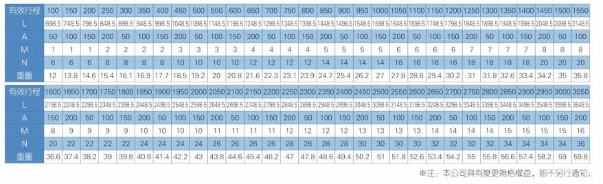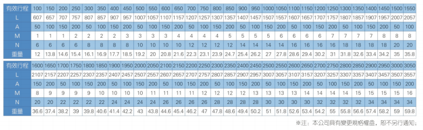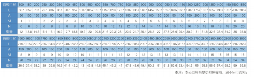 2、螺桿轉(zhuǎn)速超過臨界轉(zhuǎn)速時可能發(fā)生共振,臨界轉(zhuǎn)速和螺桿長度有關(guān),故滾珠螺桿的臨界轉(zhuǎn)速也間接決定了滑臺模組的有效行程和總長度,有效行程和常用螺桿規(guī)格轉(zhuǎn)速的關(guān)系如下列表格。