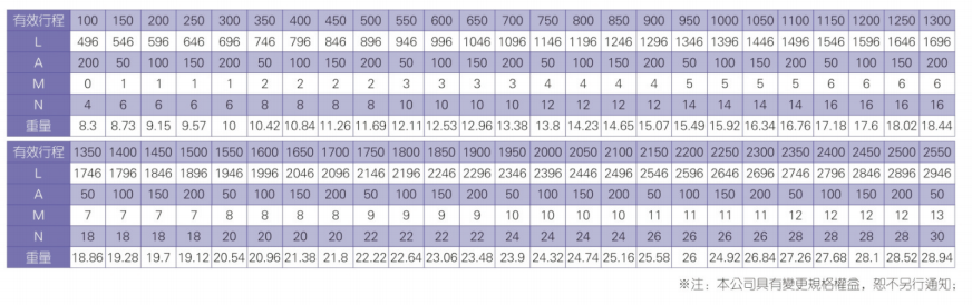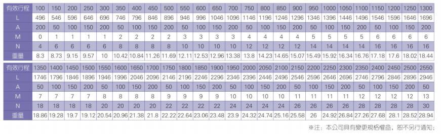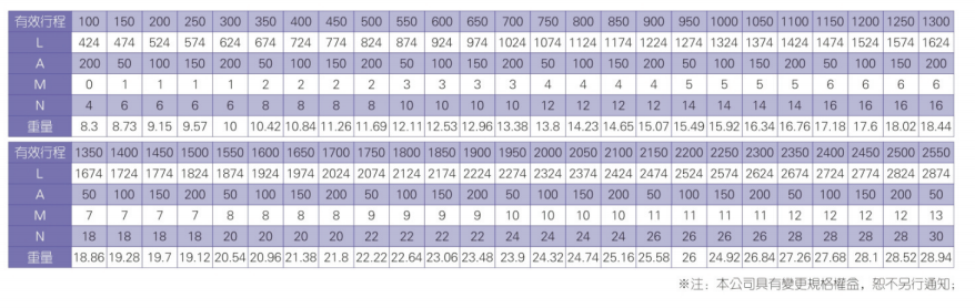 2、螺桿轉(zhuǎn)速超過(guò)臨界轉(zhuǎn)速時(shí)可能發(fā)生共振,臨界轉(zhuǎn)速和螺桿長(zhǎng)度有關(guān),故滾珠螺桿的臨界轉(zhuǎn)速也間接決定了滑臺(tái)模組的有效行程和總長(zhǎng)度,有效行程和常用螺桿規(guī)格轉(zhuǎn)速的關(guān)系如下列表格。