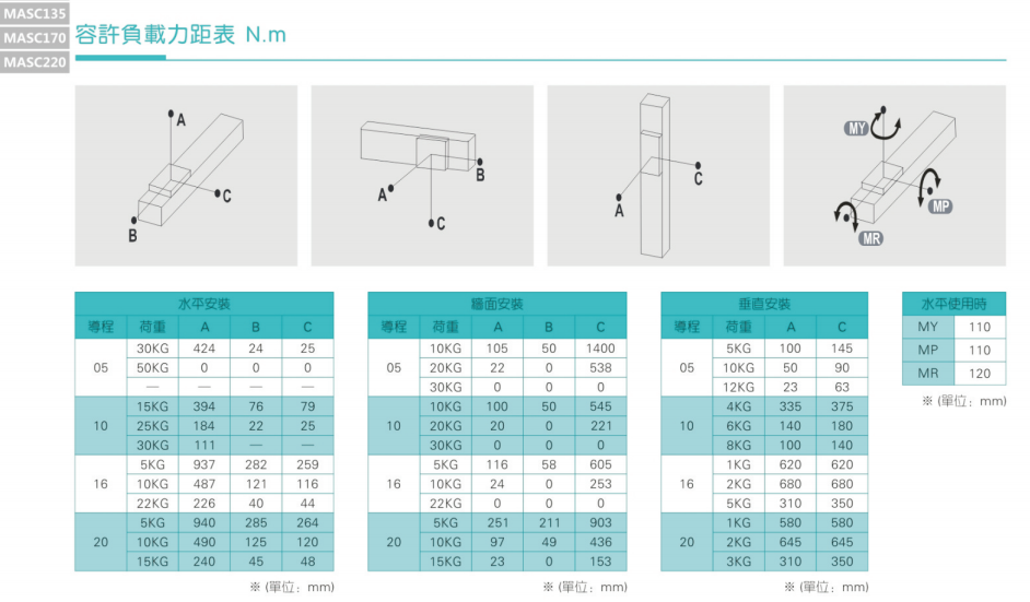 3、加減速度會(huì)使搬運(yùn)質(zhì)量產(chǎn)生慣性負(fù)荷,加減速度越大可搬運(yùn)質(zhì)量會(huì)越??;而且過大的加減速度會(huì)產(chǎn)生較大的重勢(shì)力,設(shè)計(jì)時(shí)需納入考量規(guī)范。